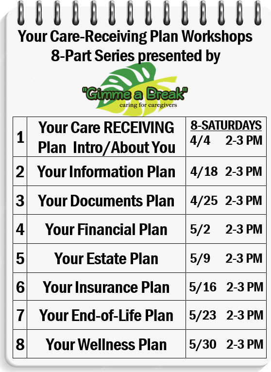 Gimme A Break present the CARE-RECEIVING PLAN WORKSHOPS! This 8-part series will cover all aspects of the plan that you need to prepare to be taken care of. It is never too early to make your Care-receiving experience one filled with more joy and less worry!
