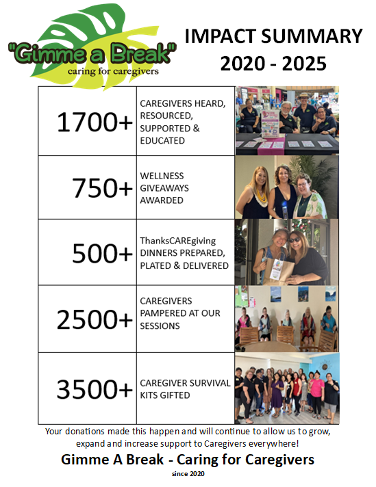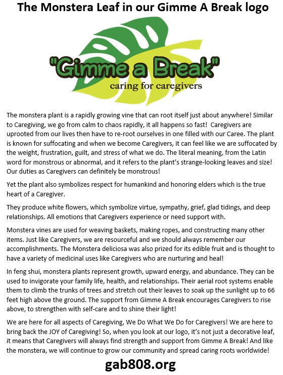 Gimme a Break is based on caring for the caregivers to provide support, resources, and outreach that promotes self-care and survival! We are all Caregivers, we either were, are or will be! Caregivers deserve support and Caregivers deserve to SURVIVE!